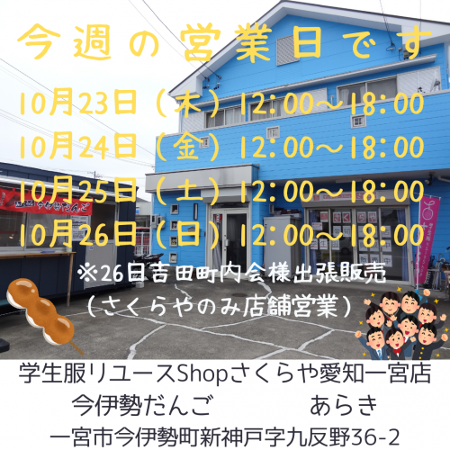 10月26日(日曜日)12:00〜18:00 ※今伊勢だんご出張販売のため、だんご店舗お休み