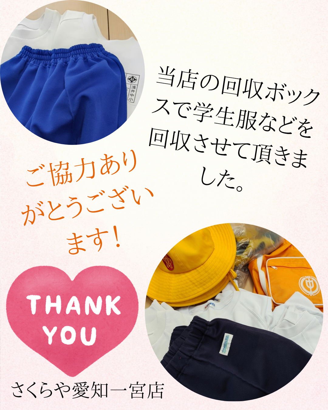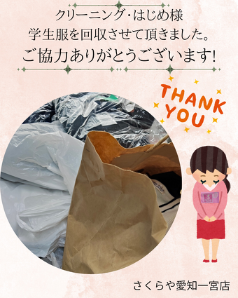 卒業して、不要になった学生服を安心してつないでもらえると、親御様から嬉しいお声を頂戴しております。全国にあるさくらやは、こどもの学生服応援団です!親御さんの家計応援隊です!!味方になれるよう、頑張ります!!