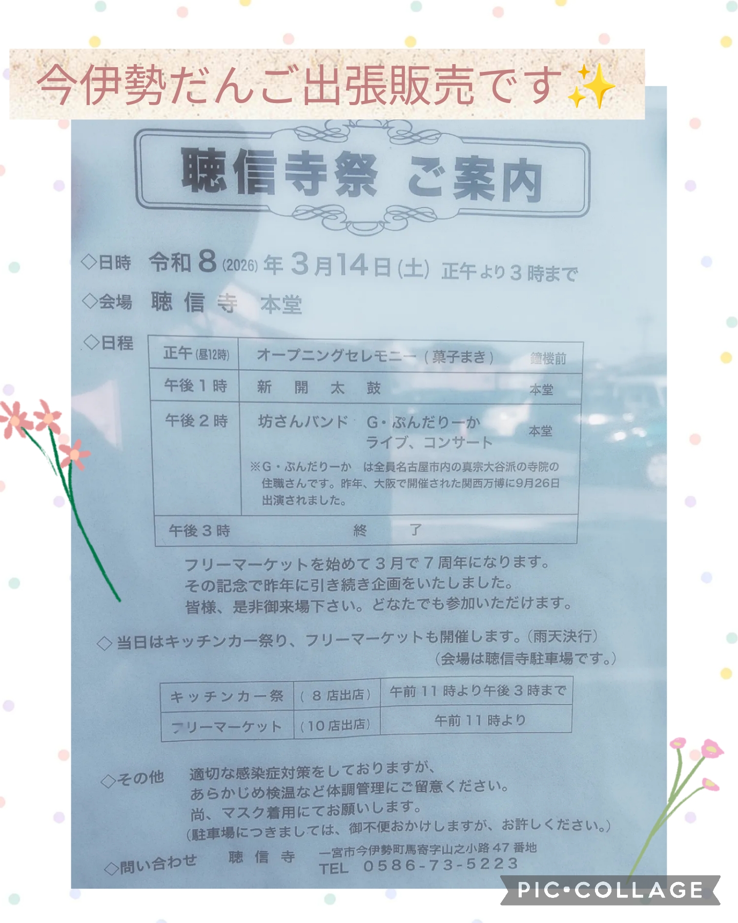 3月14日(土)11時から、聴信寺さまで今伊勢だんご出張販売です!