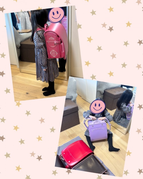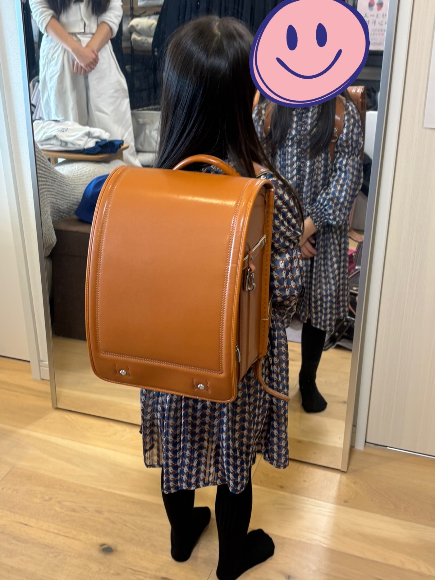 茶色がご希望というお嬢さんに、茶系のランドセルを中心にご用意しました。ピンクやパープルも気になりますが…初心貫徹で最初に気に入ったキャメル色のランドセルに決めました。お洋服の雰囲気にもよく合っていらっしゃいます。