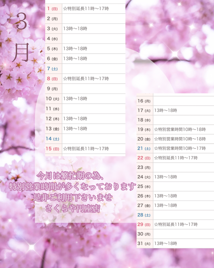 3月は繁忙期の為、特別営業時間になりますので是非ご利用下さいませ😊