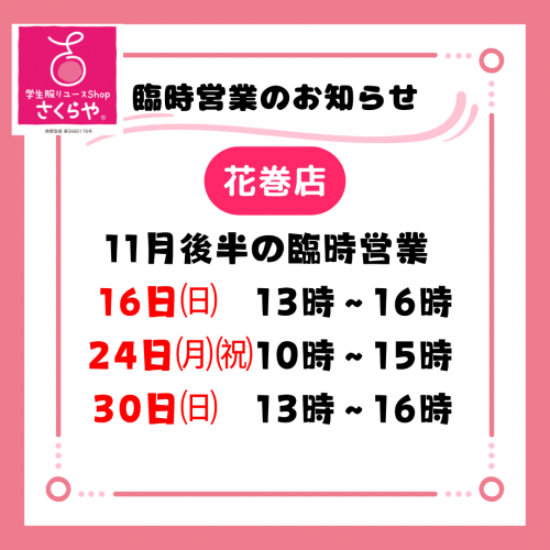 花巻店の11月後半の下記の日曜祝日は休まず営業します。