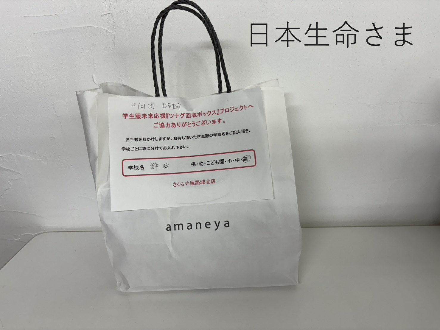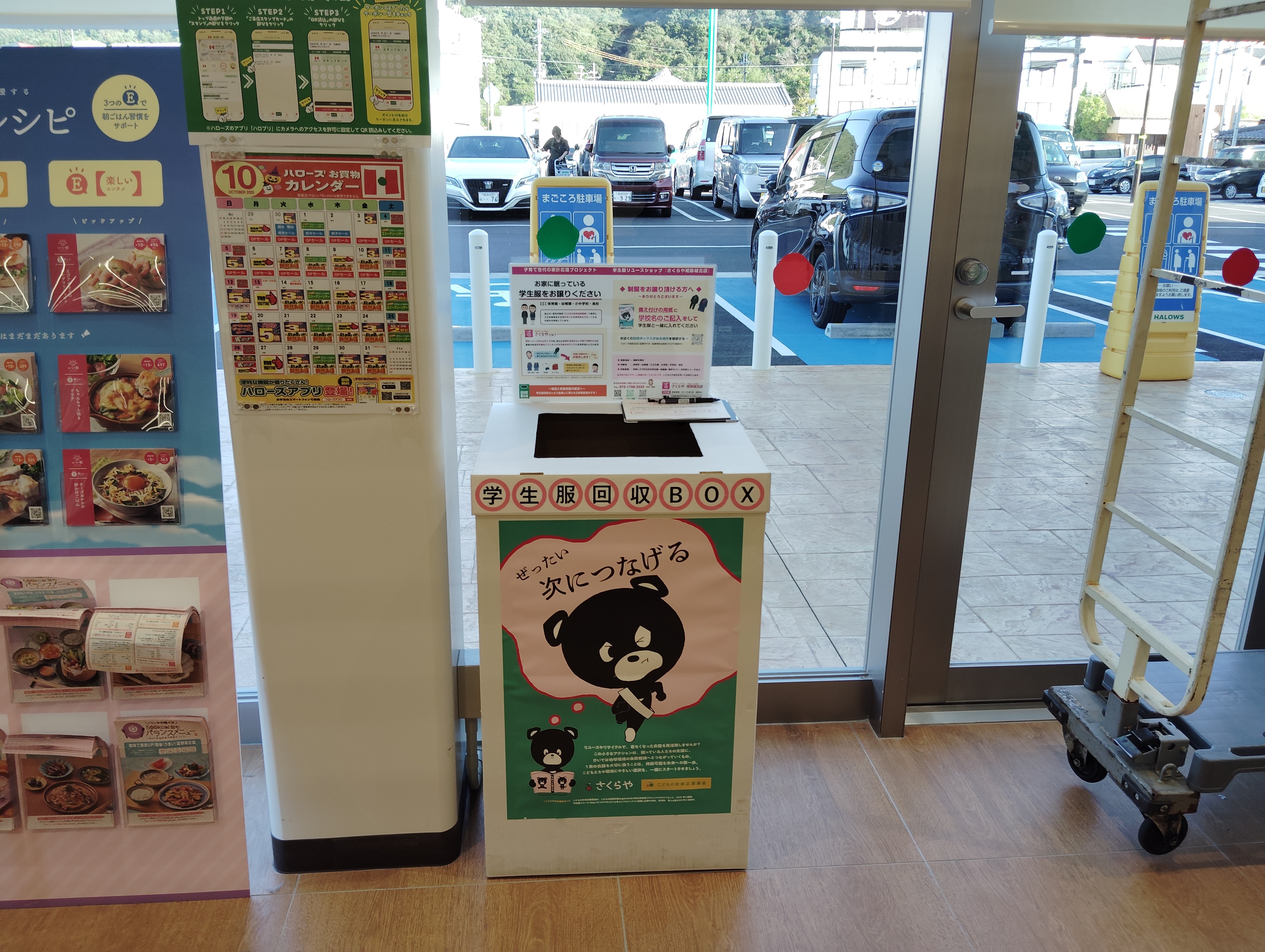 本日、回収に伺ったところ、日本生命姫路支社様、ハローズ東姫路様に学生服等が回収できました。また1週間前に回収ボックスを設置させて頂いた、ハローズ砥堀店様にも学生服が入っていました。協力企業の皆様並びに市民の皆様、本当にありがとうございます。