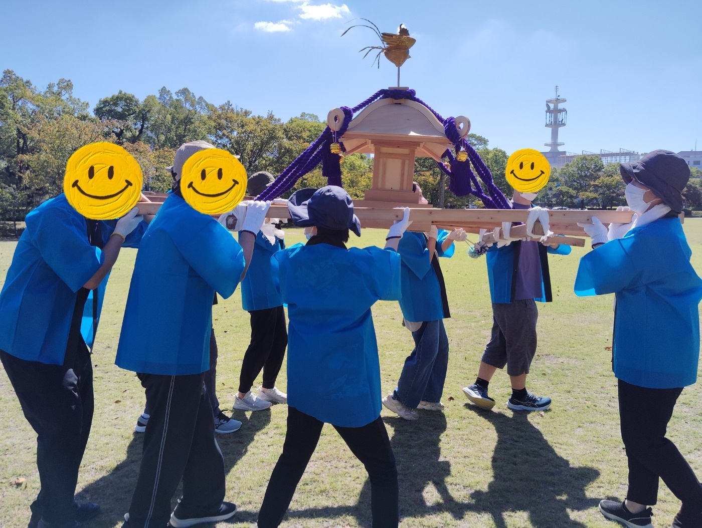 兵庫県南西部は播州地域と呼ばれ、昔から祭りが盛んで10月になると各地で、秋祭りが盛大に繰り広げられます。地元では、この土日に、お祭りがあります。併設の障がい者施設(生活介護:定員9名)で、お祭り気分を味わってもらうため、1日早い本日、“秋祭り”を企画しました。今日は利用者の皆さんが主人公です。支援者の方から、こども神輿(みこし)をお借りし、参加者全員はっぴ姿で勢ぞろい。雲一つない青空の下、姫路城付近の公園で、屋台を担いで公園内を練り歩きました。体を動かした後に食べるお弁当も美味しかったです。皆さんの溢れんばかりの笑顔と楽しそうな表情は、正に“破顔一笑”そのものでした。