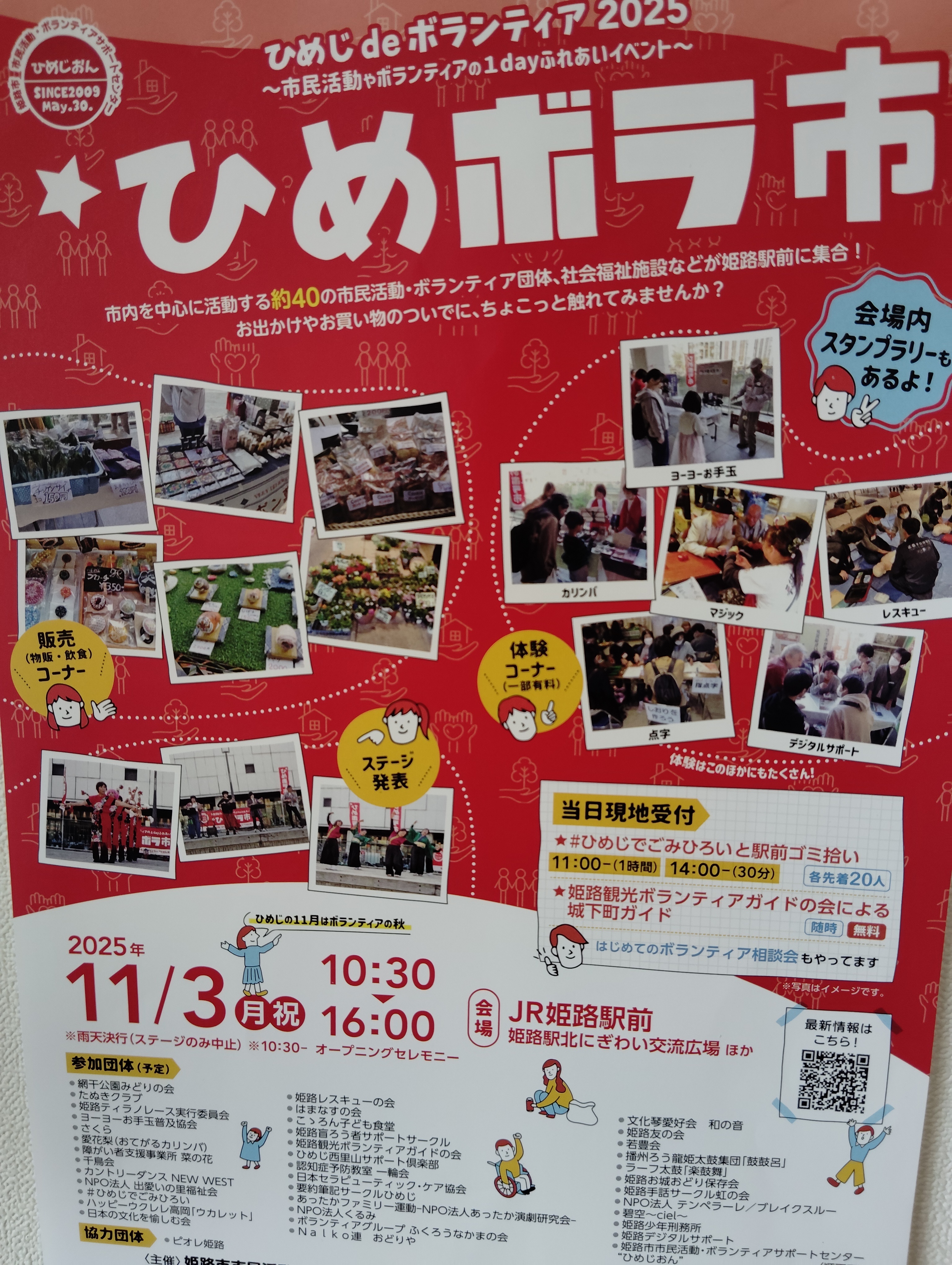 11月3日(月・祝)、姫路市市民活動・ボランティアサポートセンター主催による「☆ひめボラ市」に参加しました。JR姫路駅前をメイン会場に、市内ボランティア39団体が集まりました。市長挨拶、オープニングセレモニーから始まって、体験・販売・ステージ発表など1日盛大にイベントが行われました。当店ではリユースランドセル無償(0円)譲渡会を開催しました。お陰様で来年、再来年小学校入学予定の3人の方にリユースランドセルをバチンタッチすることが出来ました。いづれもお子様自身が、ご自分で選んだものです。市民の皆さまから頂いた“善意の贈り物”を、必要とされている方に無償でお譲りできました。また学生服2点を持参して頂いた方もいました。子様連れのご家族や他の参加団体の方々に、さくらやの取り組みをお話しすると、皆さん興味深く聞いて頂きました。「良い取り組みですね」、「家に制服があります。今度回収ボックスに入れますね」、「チラシ下さい。知り合いに広めます」などの申し出がありました。ありがたいことです。感謝します。本当にありがとうございました。