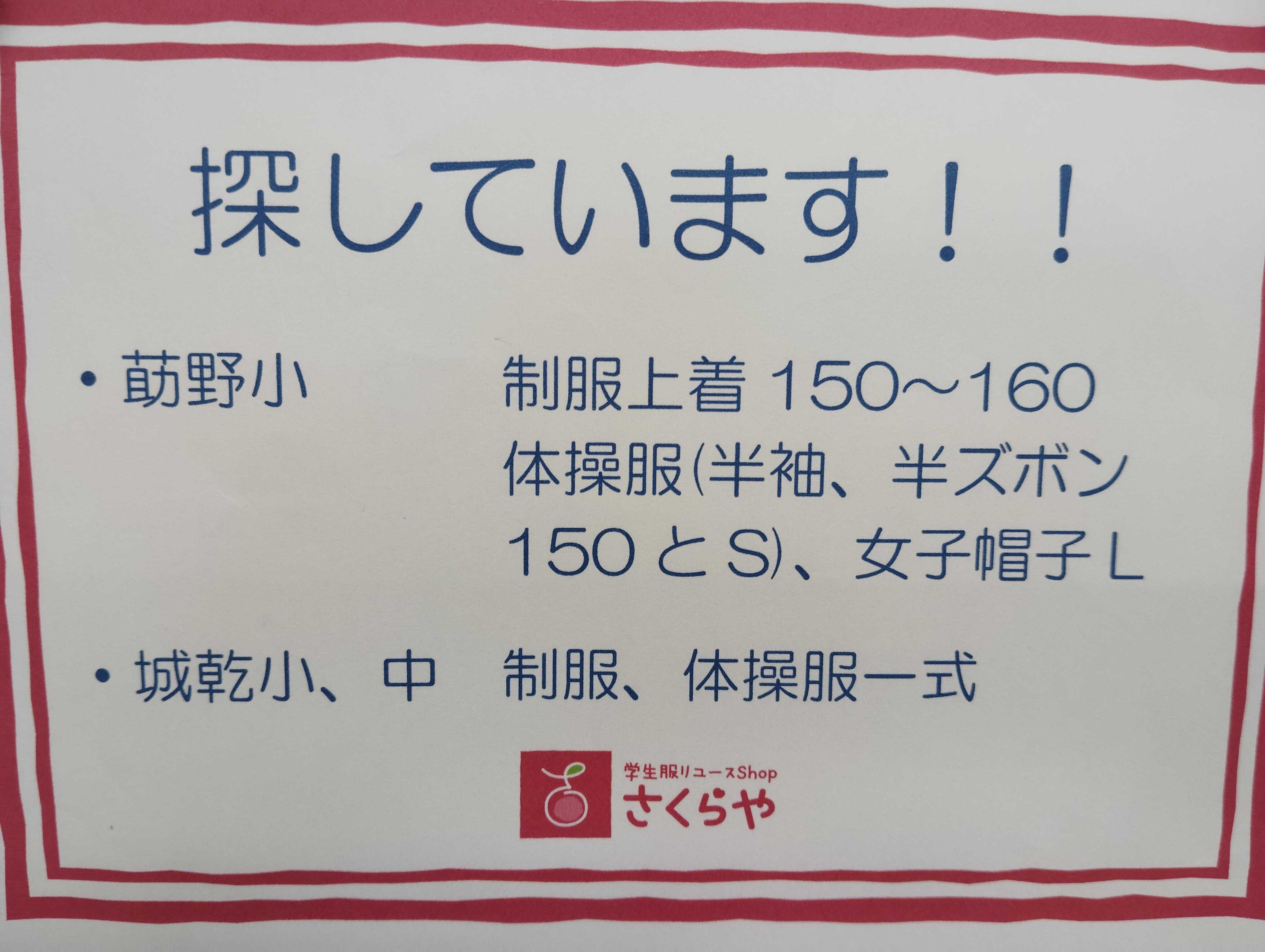 お探しの方がいらっしゃいます🍀。もし、ご家庭に眠っている学生服や体操服等があれば、ぜひお力をお貸し
