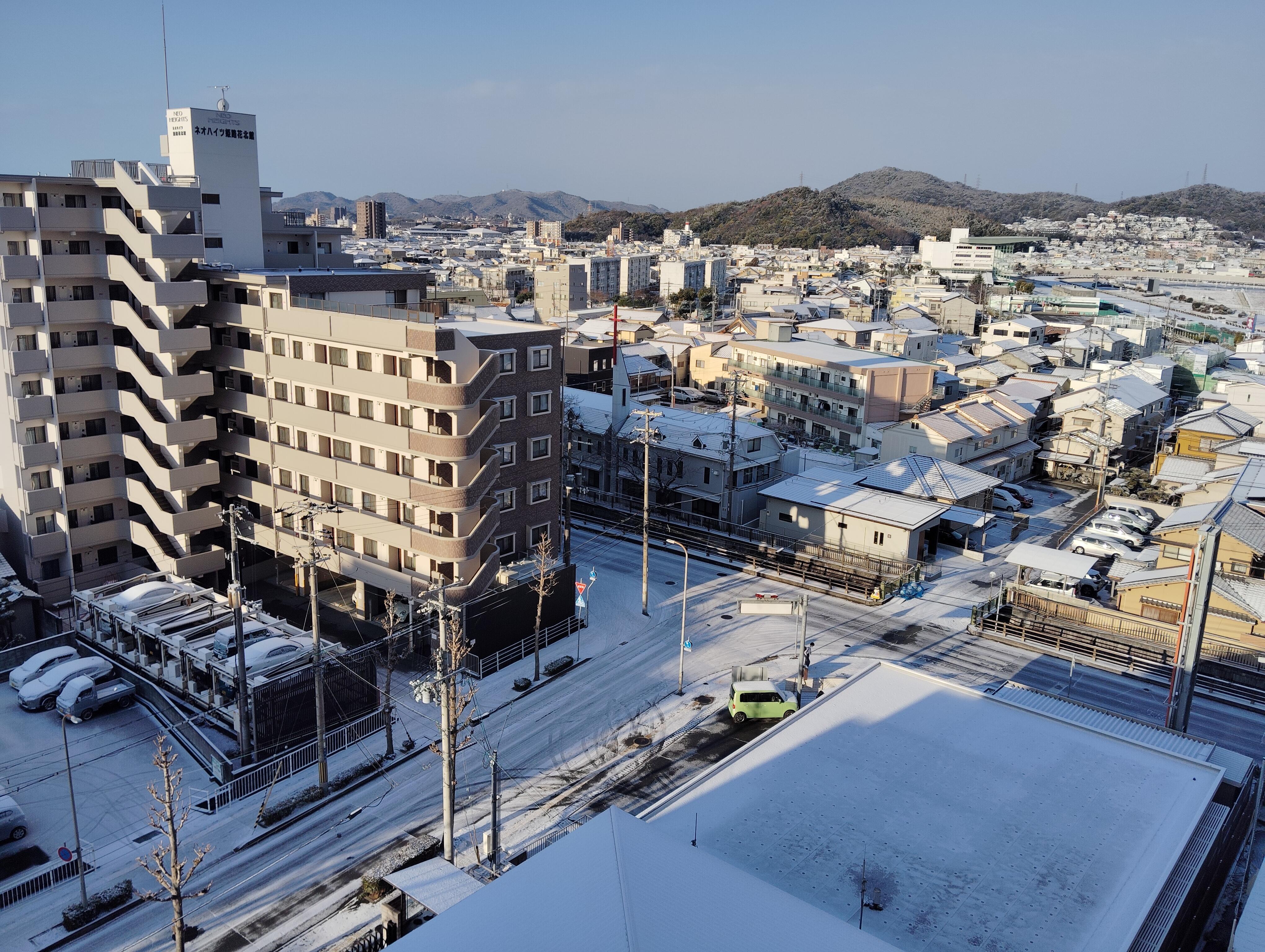 今朝の姫路市内の様子です。昨日からの雪で、一面、雪化粧です。 道路状況ですが、気温低下により早朝および日陰を中心に路面の凍結が発生しやすい状況です。通勤、通学をはじめ外出時には十分ご注意ください。
