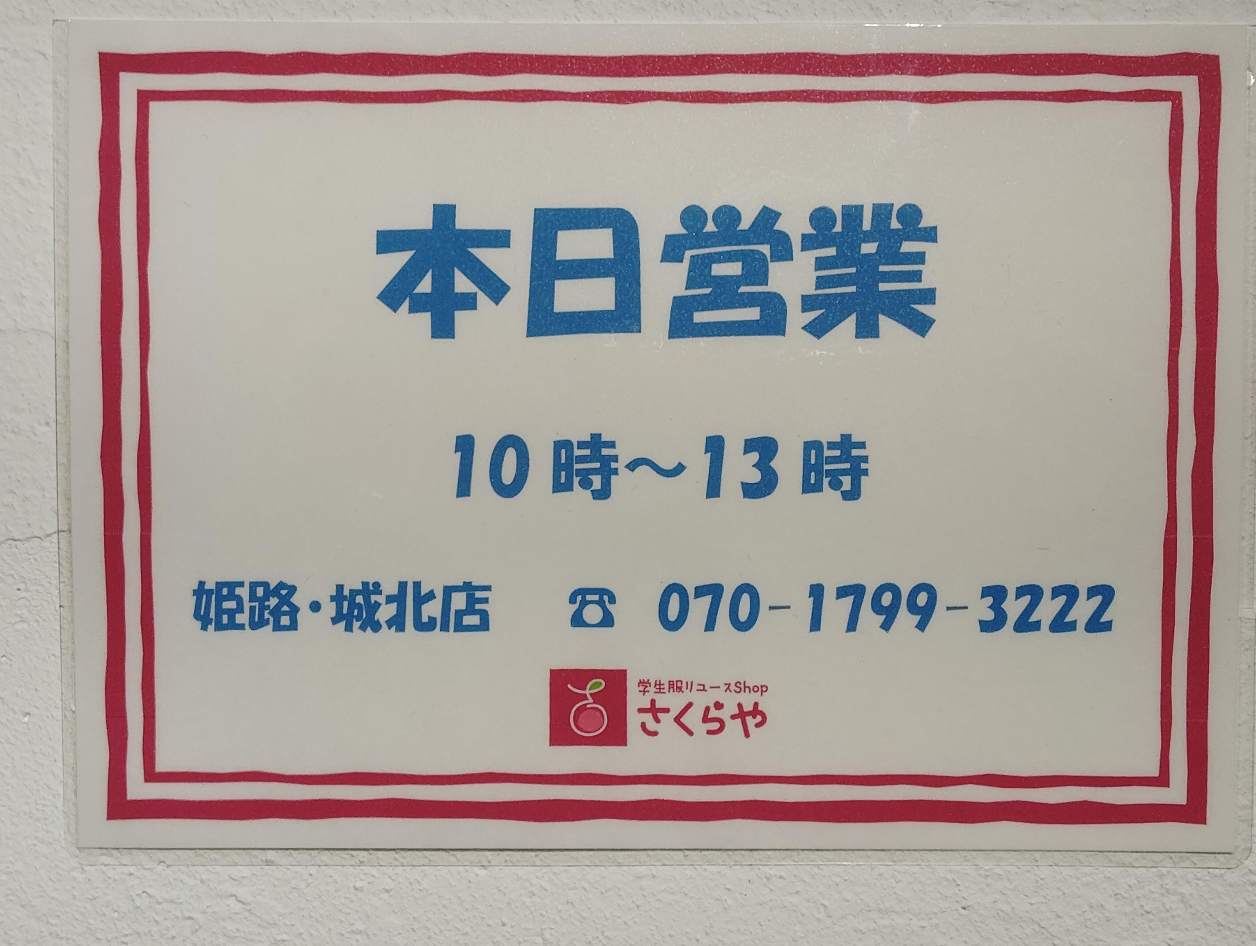 学生服リユースショップさくらや姫路・城北店(ひめじ・じょうほくてん)です。4月25日(土)10時~13時、営業しております。ご来店、心よりお待ちしております。