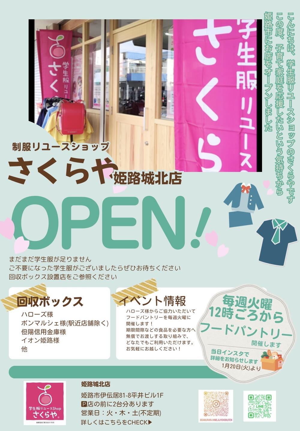 さくらや姫路城北店では、ご不要になった学生服や体操服、未使用文房具品などを、お譲り下さる方を探しています。本当に必要なご家庭におつなぎします。また売り上げの一部を内閣府「子どもの未来応援基金」へ寄付し、こども食堂など全国の子ども支援団体をサポートします。