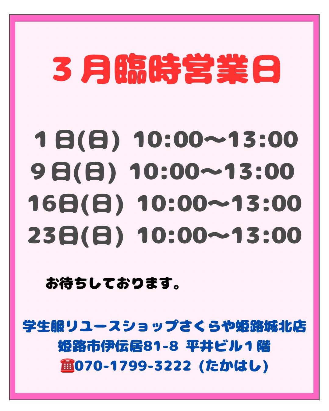 学生服リユースショップさくらや姫路・城北店(ひめじ・じょうほくてん)です。3月の臨時営業日をお知らせします。