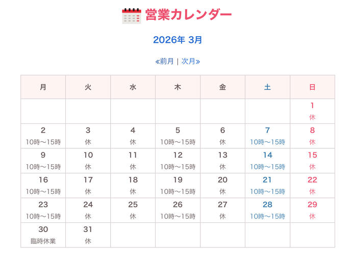 営業時間は月、木、土の10時〜15時です。都合により休む事もございますので、ご来店の際は営業カレンダーをご確認ください。営業時間中に来店するのが難しい方は、ご相談いただければ可能な限り対応いたしますのでメール、LINE でご相談ください。