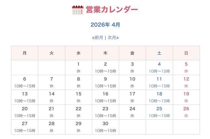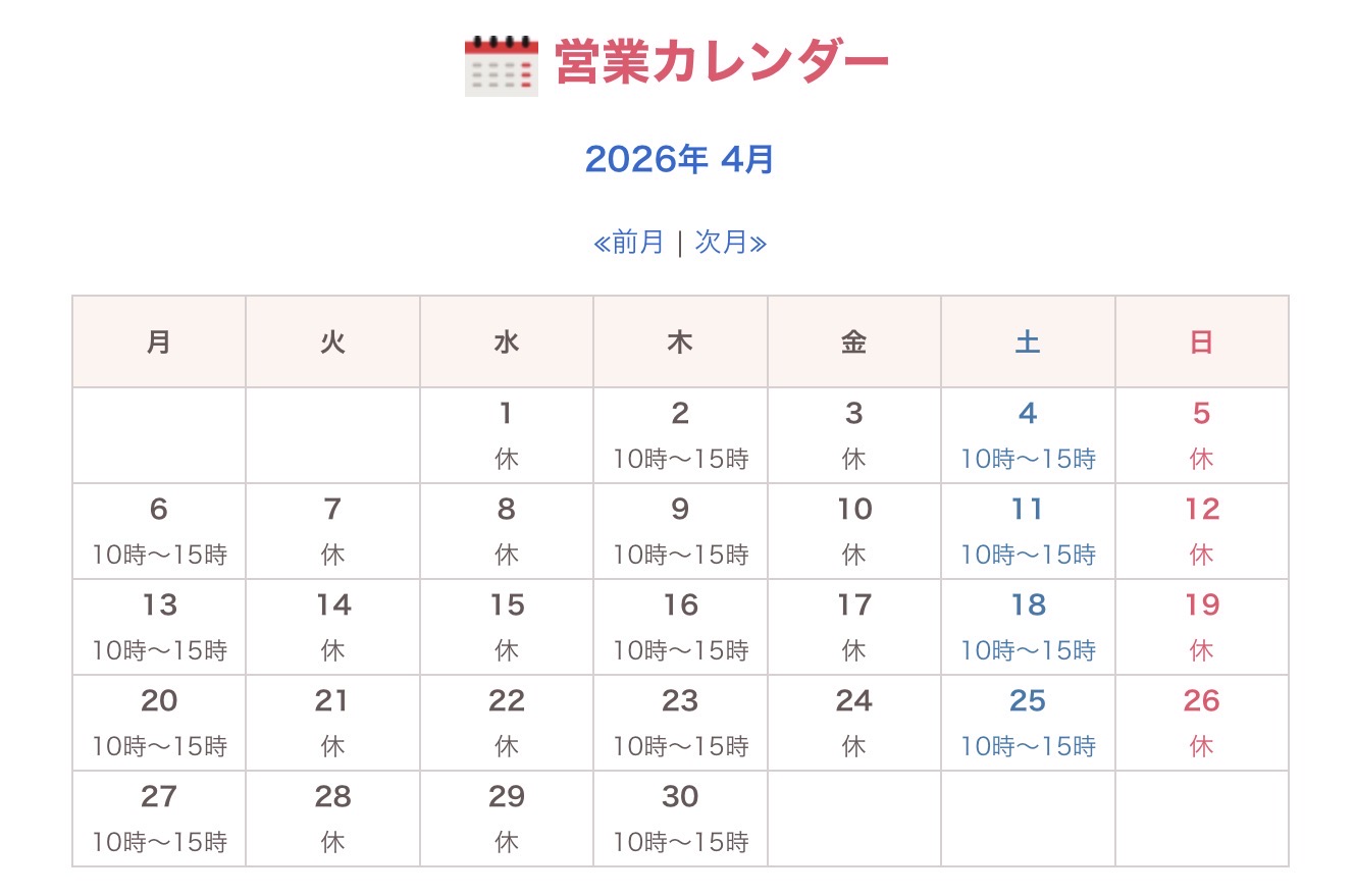 営業時間は月、木、土の10時〜15時です。都合により休む事もございますので、ご来店の際は営業カレンダーをご確認ください。営業時間中に来店するのが難しい方は、ご相談いただければ可能な限り対応いたしますのでメール、LINE でご相談ください。