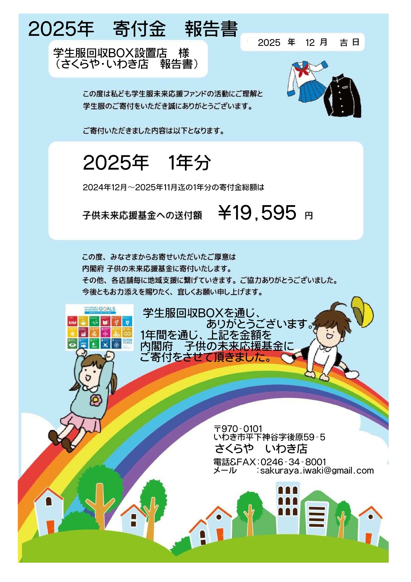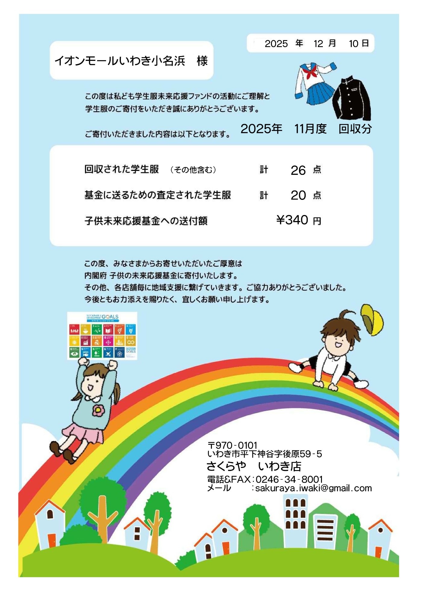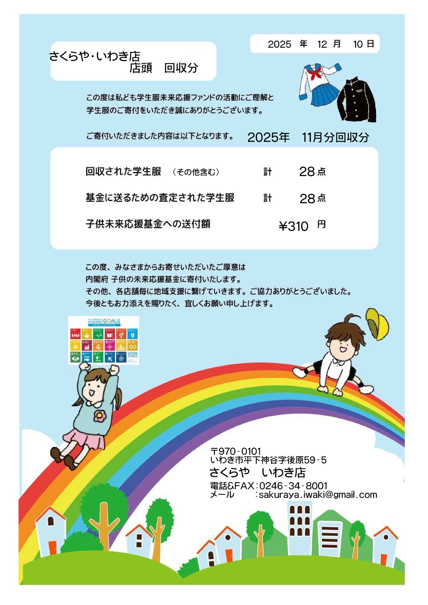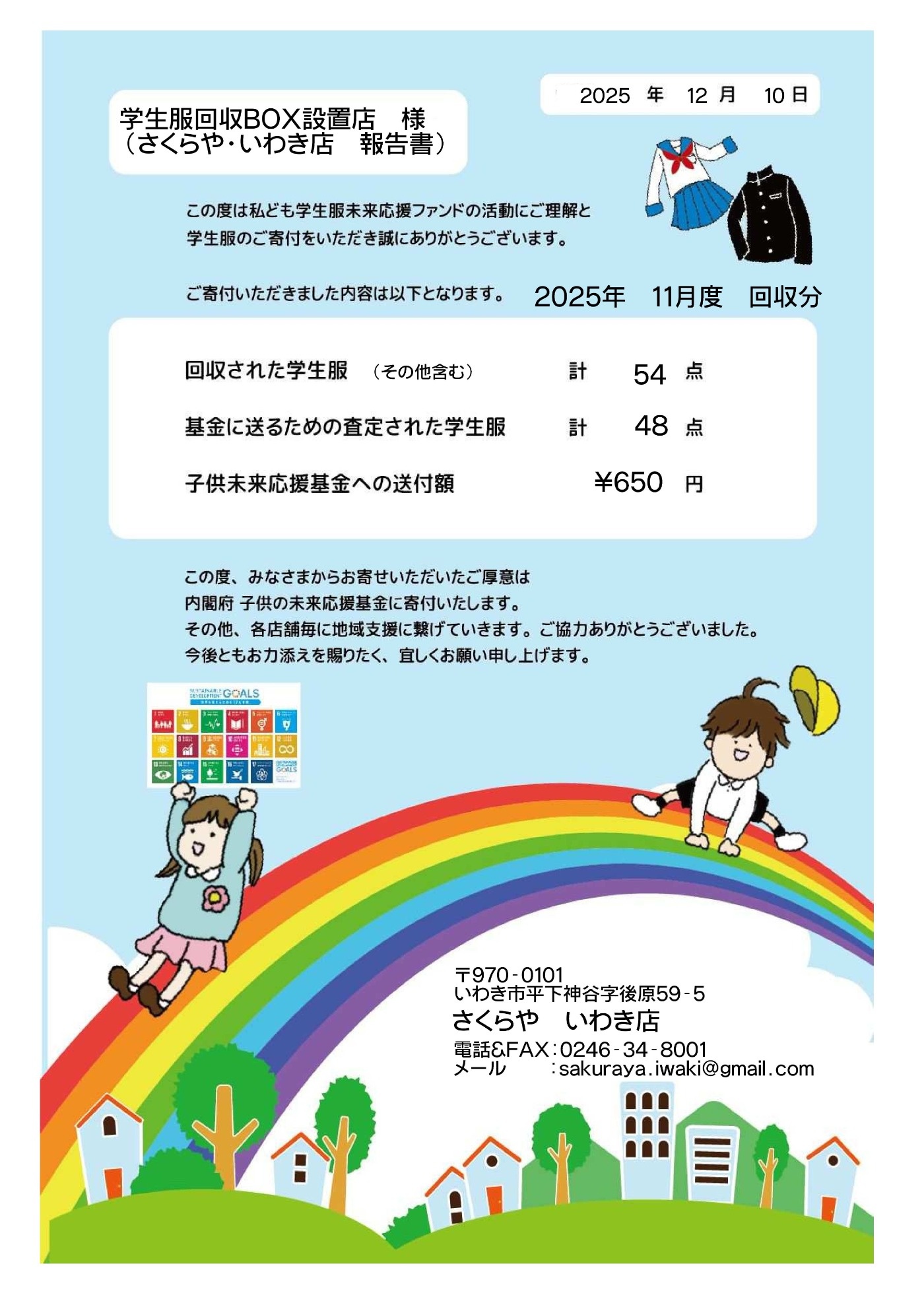 学生服回収BOX 寄付金の報告 2025年11月度 (内閣府 子供未来応援基金へ送金(寄付金)致します) さくらや・いわき店