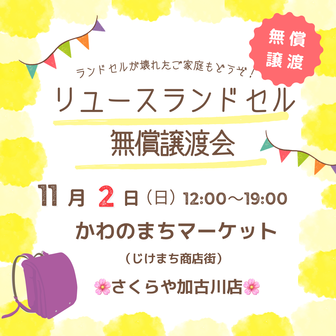 かわのまちマーケットに出店してリユースランドセル無償譲渡会を開催します♪