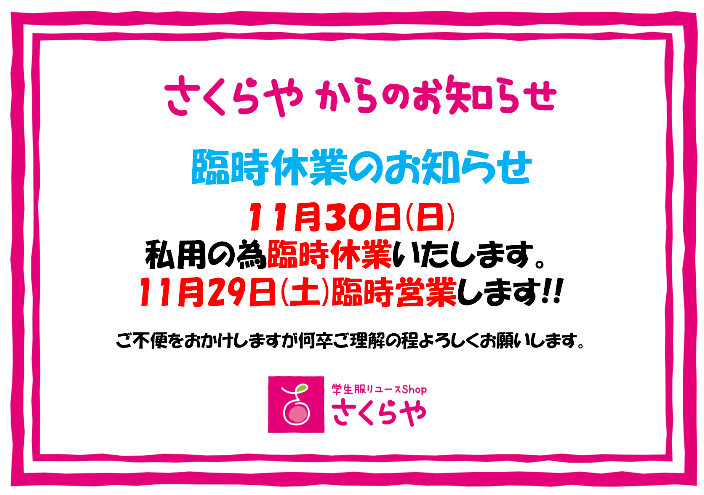11月29日(土)は臨時営業します。