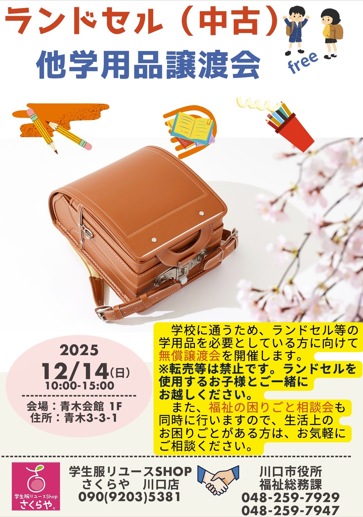 12月14日(日) 中古ランドセル譲渡会のおしらせ 青木会館
