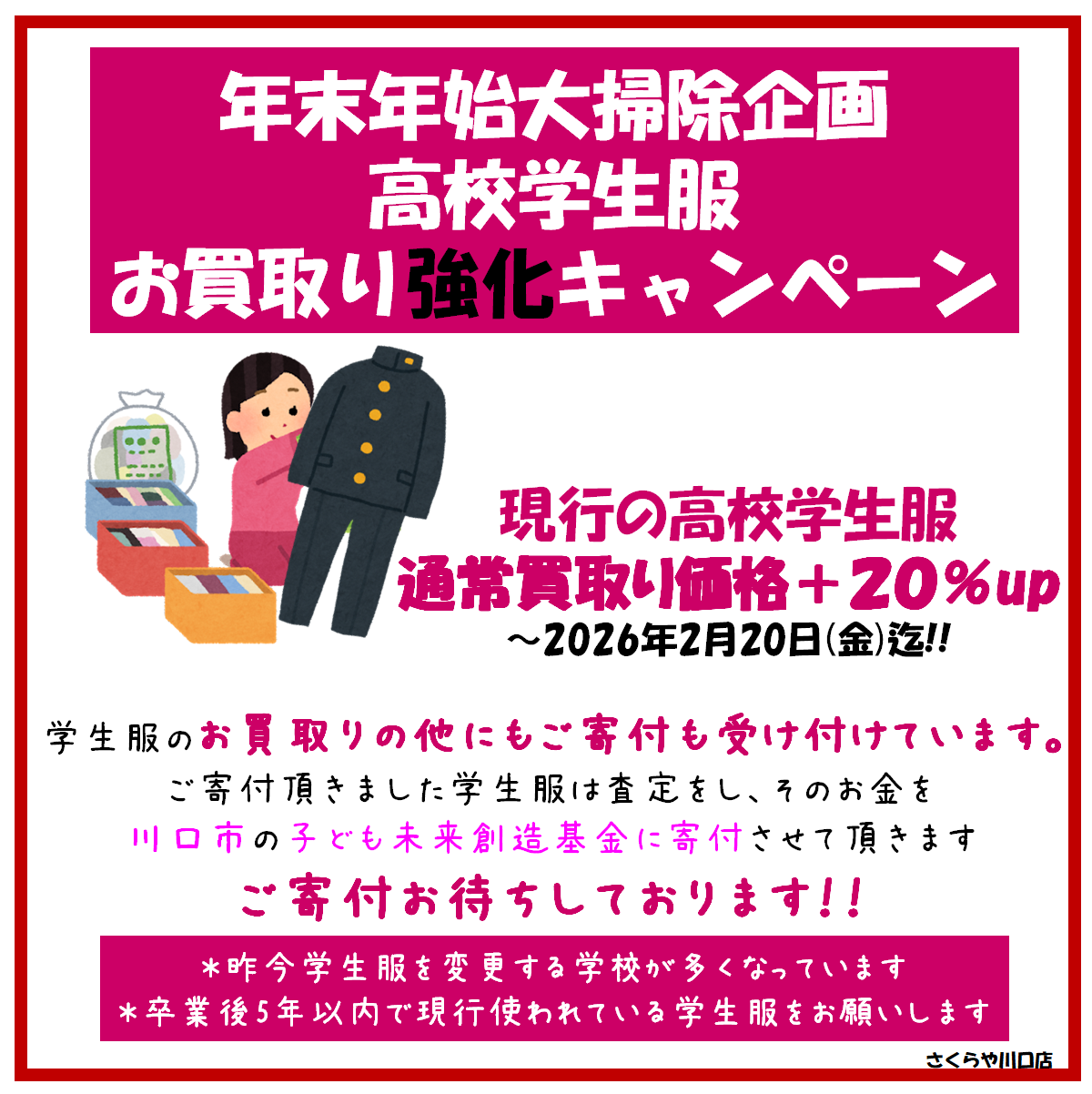 ご寄付頂いた学生服は当店で査定相当額を川口市子ども未来創造基金に入金いたします。