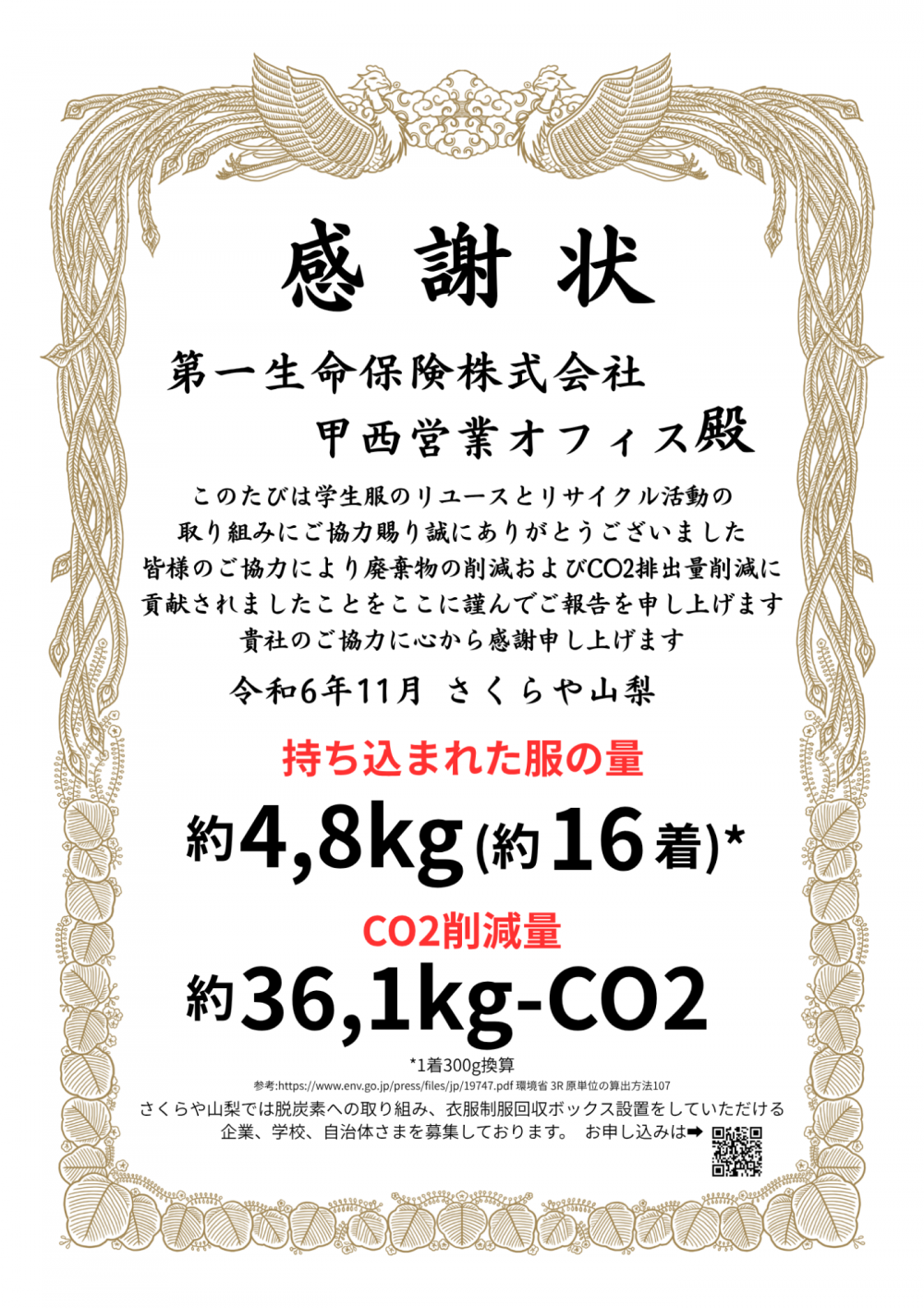 第一生命保険甲西営業オフィスさまに置かせていただいた回収ボックスに集まった衣類の回収では、これだけのCO2削減に繋がりました✨