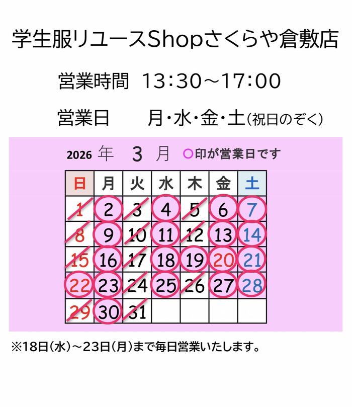 3月は18日〜23日まで毎日営業いたします。高校進学先が決まる時期です。制服、体操服など探しにぜひご来店くださいませ。お待ちしております。