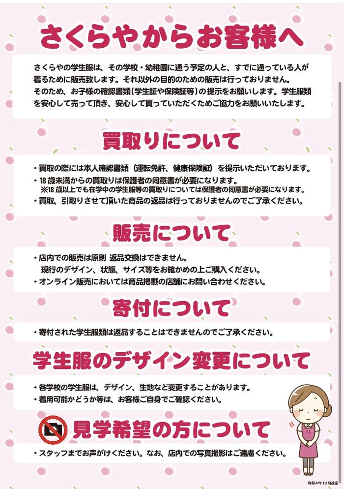 さくらやでご購入を検討されていないサイズ合わせのみが目的のご来店はできかねますので、ご了承くださいませ。