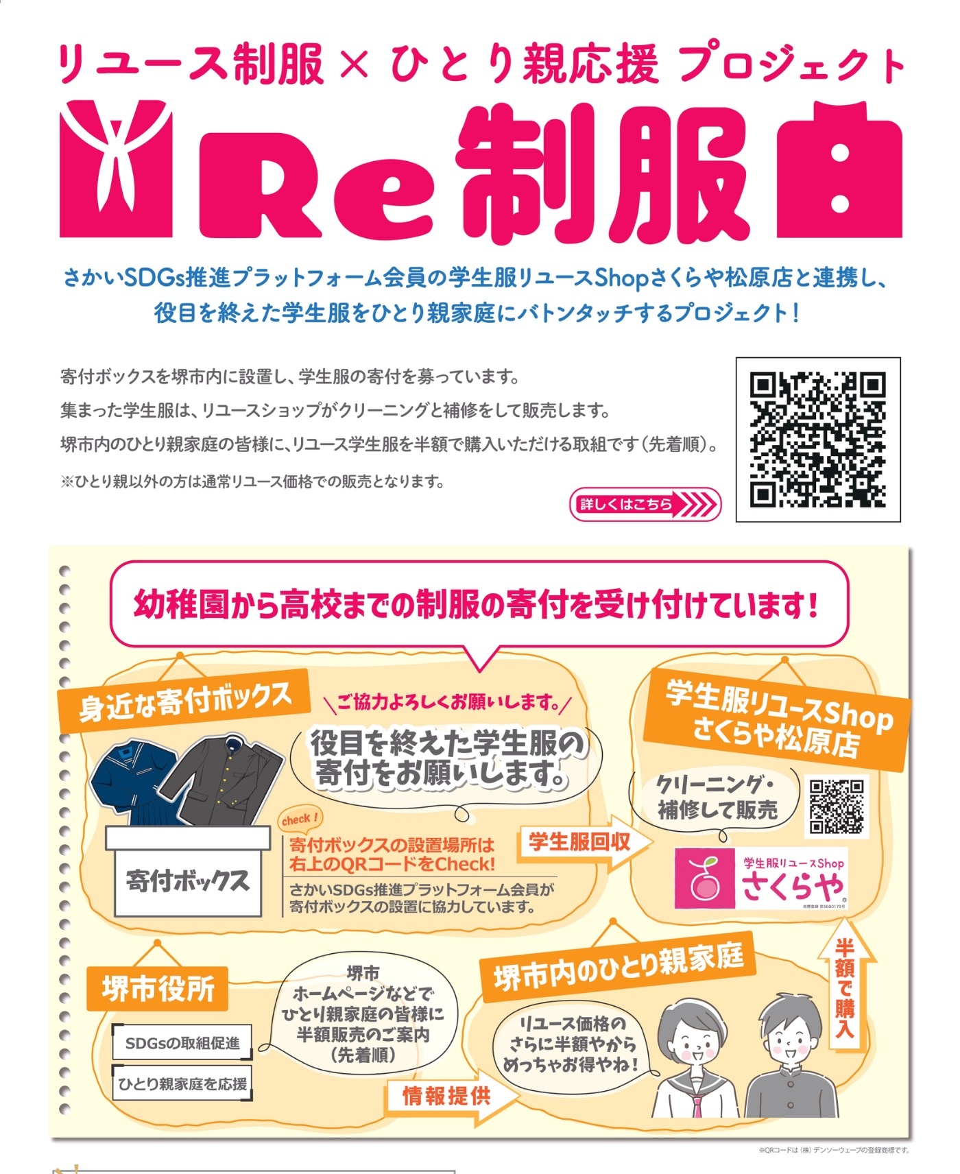 この事業は堺市内各所の事業者さんにご協力頂き、制服寄付回収BOXを設置し、回収されたリユース制服をさくらや松原店が集め、補修を行って半額で提供する取り組みです。