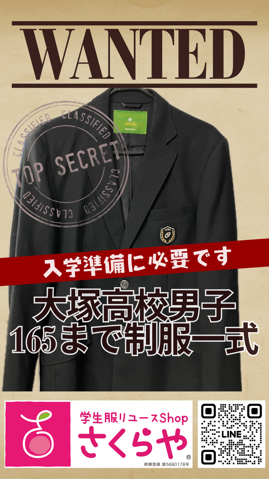 大塚高校男子165一式探しています