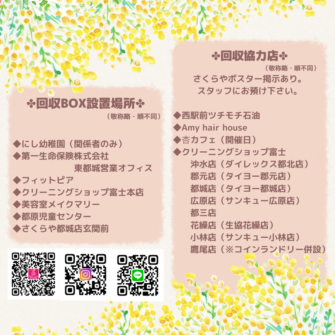 寄付につきましては、引き続き、回収BOXにて随時受け付けております。