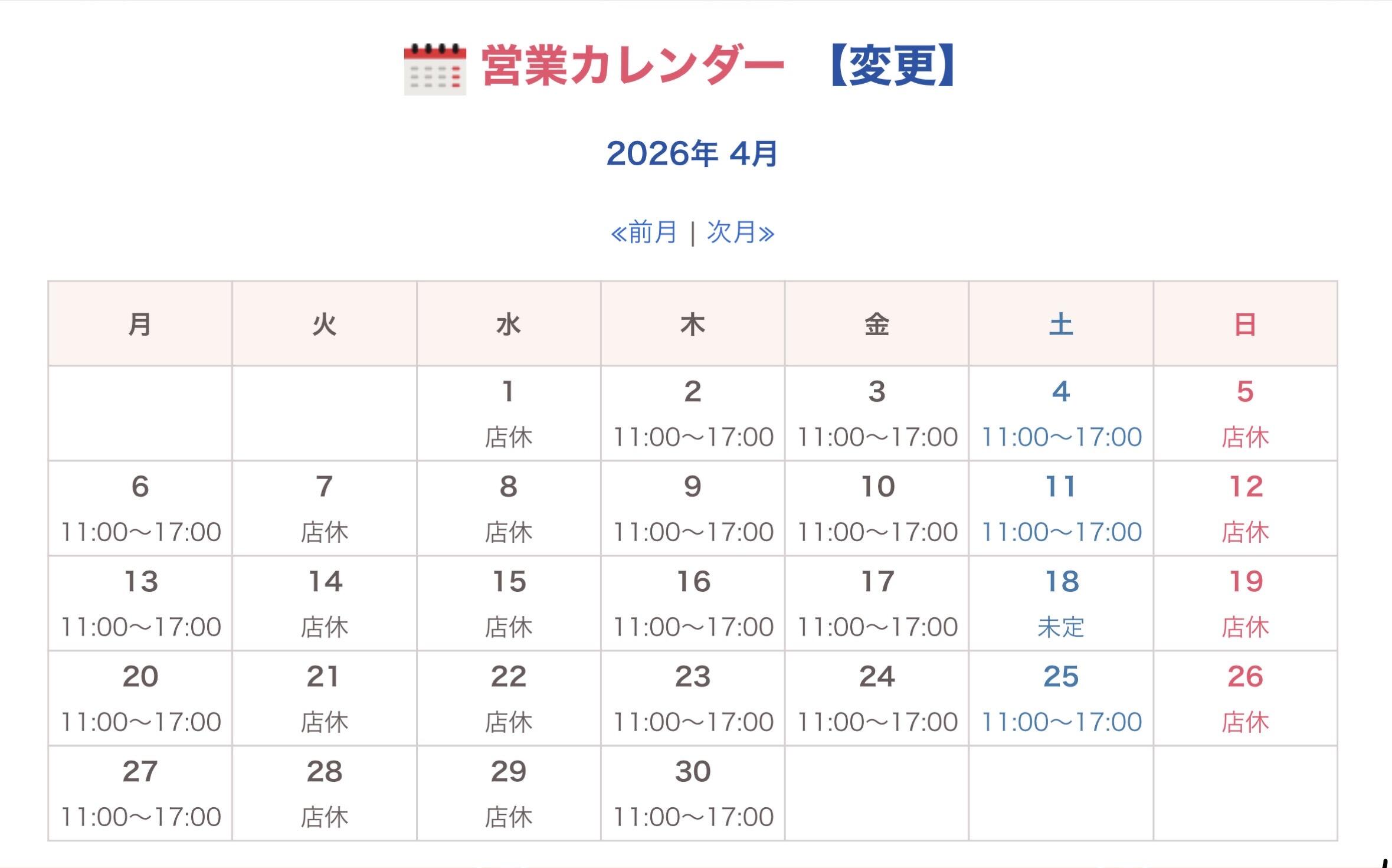 2 11:00〜17:00 3 店休 4 店休 5 11:00〜17:00 6 11:00〜17:00 7 11:00〜17:00 8 店休