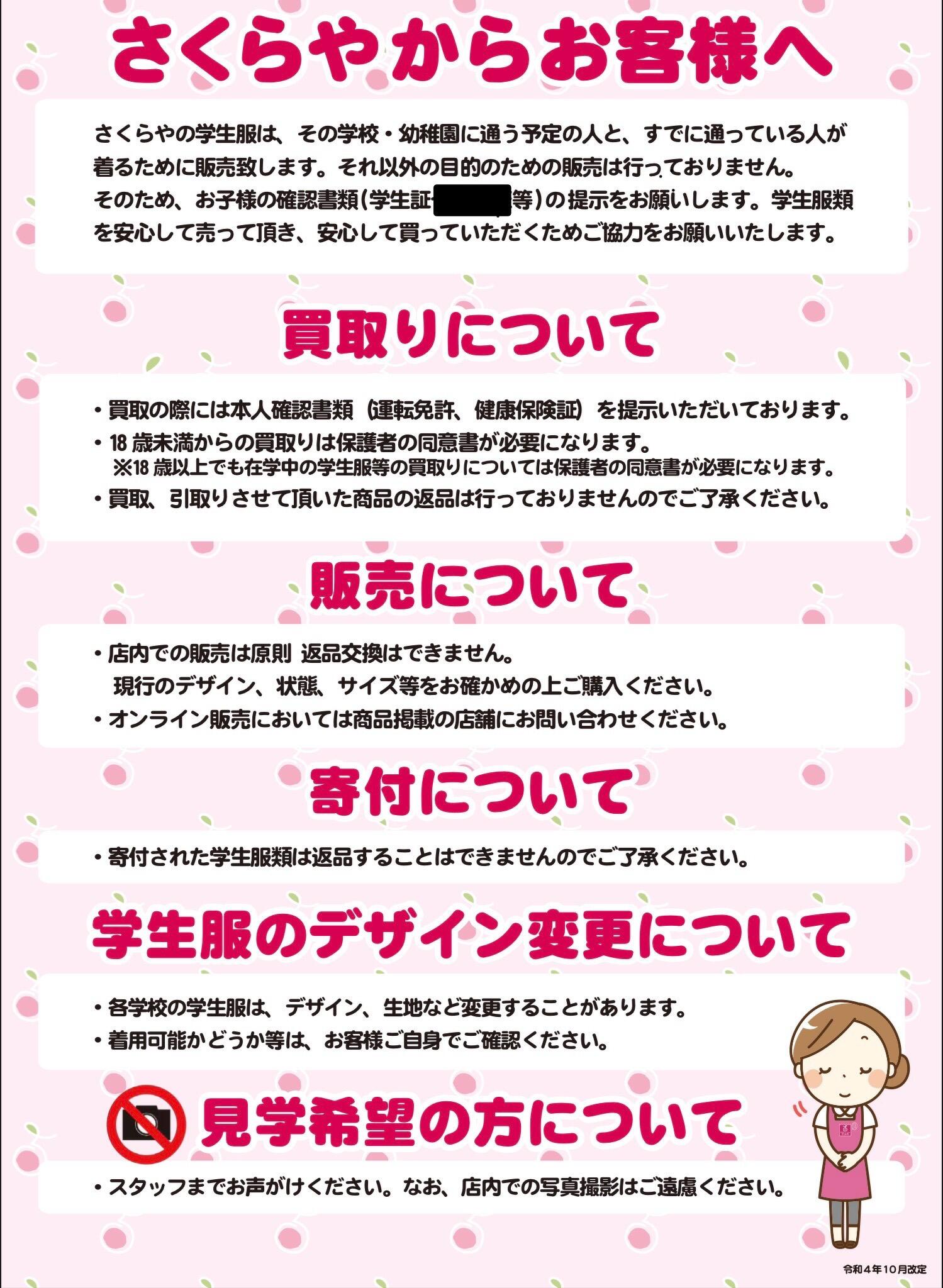 制服を安心して売っていただき、安心して買っていただく為、ご理解とご協力をお願い致します。