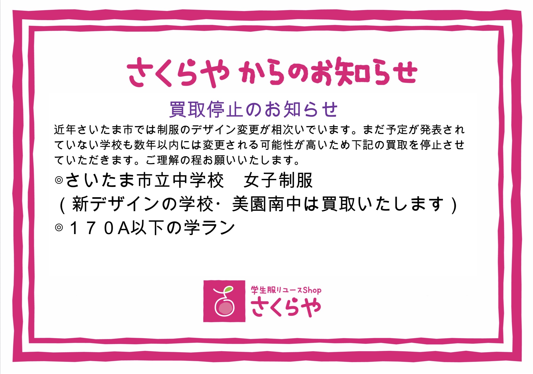 さくらや 東浦和店 は幼稚園〜高校生までの学生服の買取・販売しております。 取り扱いの学校は 主にさいたま市緑区・浦和区周辺・川口市。高校は当店から通える範囲。都内の私立高校。さいたま市や川口市から通学出来る学校はご相談下さい。 ハンドメイド品の新品販売も取り扱い開始!学生服のお見積のみも可能です。 買取・購入時は必ず注意事項を確認下さい。 お気軽にご相談下さい! ○営業日 月・木・金・土 ○営業時間 11時〜17時 ※営業日・営業時間が不定期で変わる場合がございますので、詳しくは営業カレンダーにてご確認下さい。