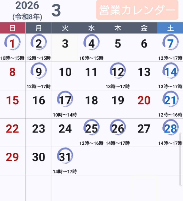 遅くなりましたが、3月の営業カレンダーをお知らせいたします。