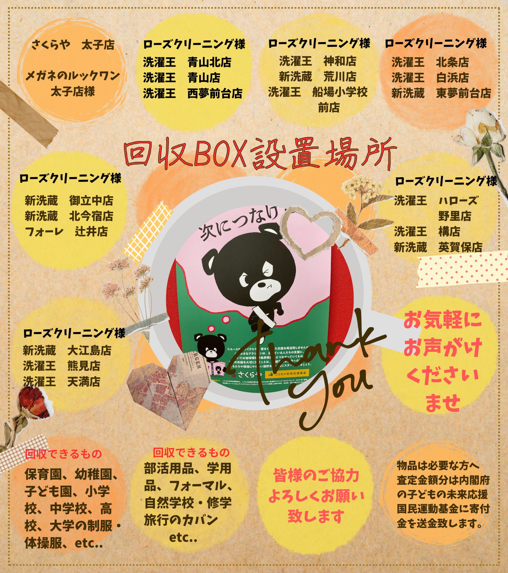 回収BOXを置いて下さる企業様、店舗様の募集もしております。どうぞ宜しくお願い致します。