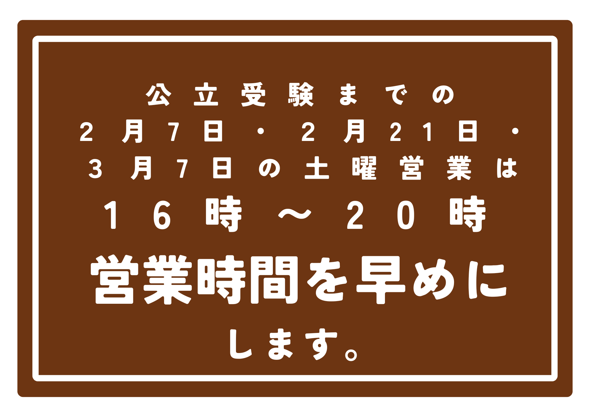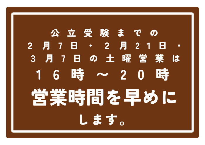 公立高校受験後の3月7日までの土曜営業日(第一・第三)は少し早めの16時~20時まで営業させていただきます。