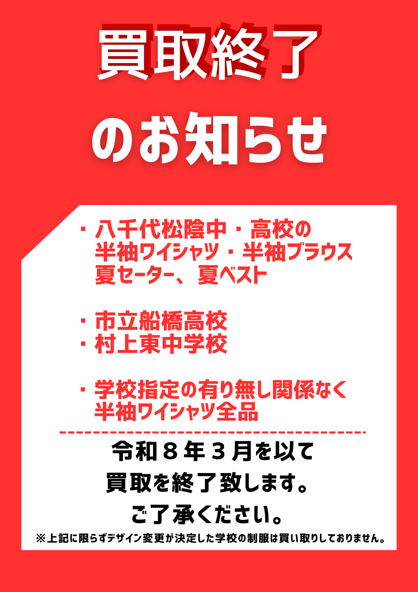 今後は半袖ワイシャツは学校の指定のあるなしに関わらず買い取りを中止させていただきます。
